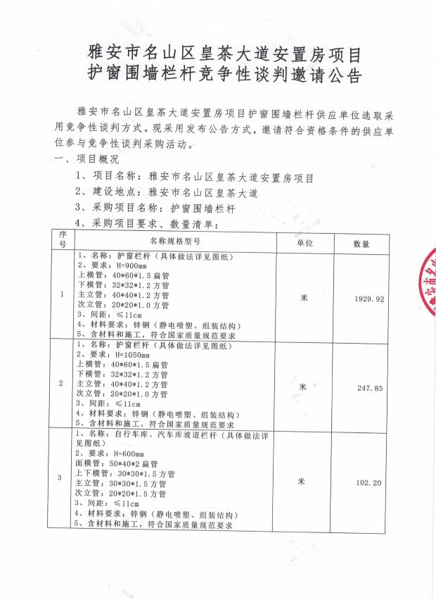 雅安市名山區皇茶大道安置房項目 護窗圍墻欄桿競爭性談判邀請公告